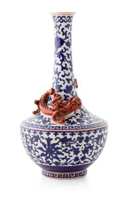 the sides decorated with scrolling flowering stems against a white ground, the slender neck applied with a coiled iron-red dragon, Qianlong seal mark