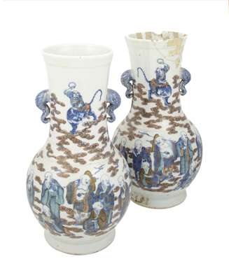 the flared necks with twin elephant mask handles, decorated with figures and clouds (2)