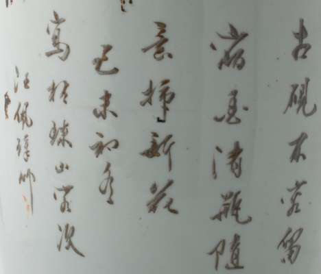 decorated with courtly ladies and boys in a garden under a plantain tree, mould mask loop handles to the shoulders, with a calligraphic poem inscription to the reverse, previously drilled for a lamp