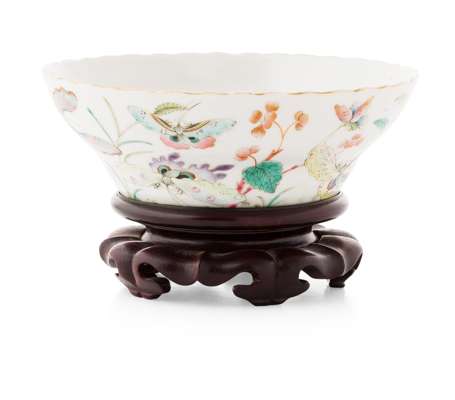 the flared sides with a gilt scalloped rim, painted with butterflies amidst blossoming plants, red seal mark, with a later wooden stand