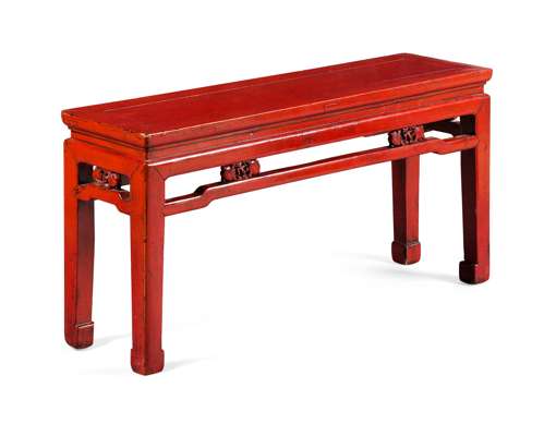 the rectangular top over a recessed frieze and raised on straight square legs joined by stretcher rails with peach carved spacers, ending on block feet