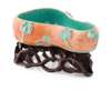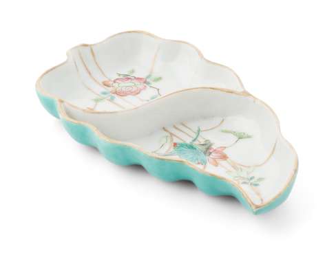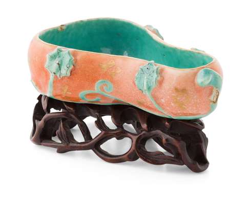 modelled as a leaf with flowering stems, 12cm long; together with another FAMILLE ROSE BRUSH WASHER, of leaf form, on a hardwood stand, Qing dynasty, 9cm long (2)