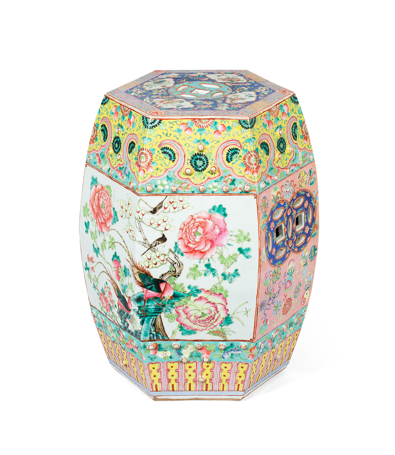 of barrel form, decorated with panels of peony, prunus, and pomegranates with phoenix and songbirds, separated by panels with coin motifs, between yellow and turquoise ground bands and moulded stud decoration