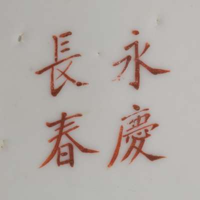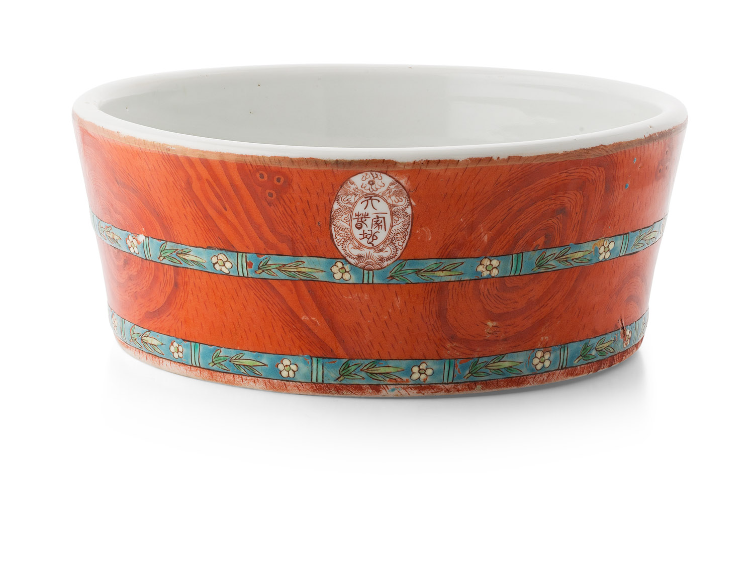 the sides painted to simulate wood grain, bound by two foliate painted bands, Dayazhai four character mark