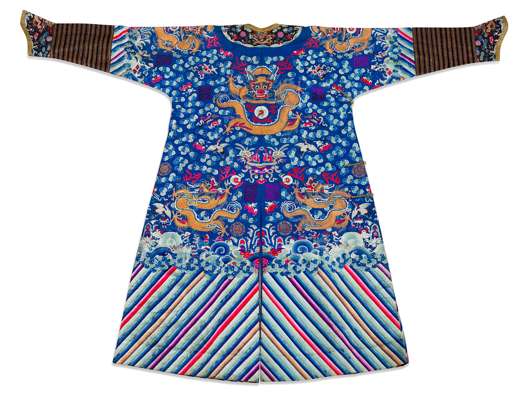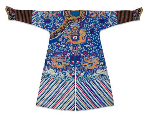 embroidered with coloured silk and gold metallic thread with ten dragons, cranes, bats, flames and clouds against a blue ground, above multicoloured standing waves to the hem, the long narrowing sleeves with gilt embroidered bands and ending in horse hoof cuffs