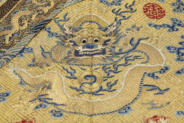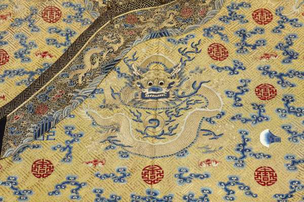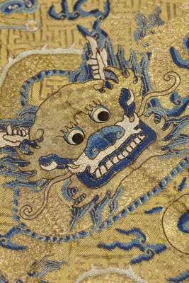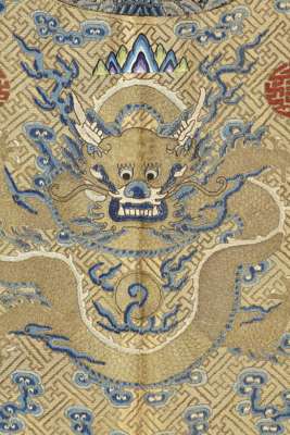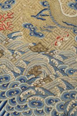 Note: The Twelve Symbols of Imperial Authority were rooted in ancient customs and their origination is unclear. Each symbol had a specific meaning and when appearing together represented the emperor's authority and unquestionable sovereignty. They are the Sun, Moon, Constellation, fu symbol, Dragon, Axe-head, Flowery Creature, Sacrificial Vessels, Water Plant, Flames, Grain, and Rock. Their placement on imperial robes was strictly regulated as established by the Qianlong emperor in the 18th century. While some members of the imperial family were allowed to wear garments embroidered with combinations of the Twelve Symbols, only the Emperor wore garments displaying all of them. This strict adherence to custom relaxed towards the end of the Qing Dynasty, and it is known that the Empress Dowager Cixi, who named herself regent and essentially ruled China during the Tongzhi and Guangxu Emperor's reigns, wore robes bearing the twelve symbols. It can be assumed that the present lot, which is a woman's robe, was designed for her use.