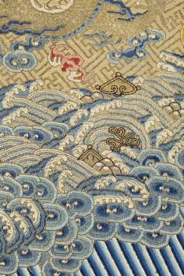 worked in gold and silver metallic thread on a gold gauze ground, embroidered with the Twelve Symbols of Imperial Authority and nine five-clawed dragons above blue standing waves at the hem, the gold silk and black gauze sleeves ending in embroidered horseshoe cuffs, with gold silk lining