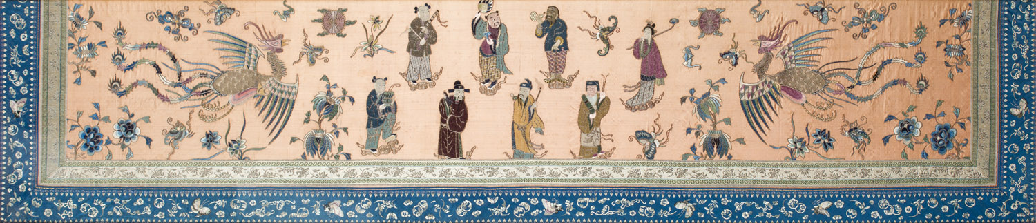 stitched in coloured and silver metallic threads depicting immortals standing between phoenix on a peach silk ground filled with flowers and insects, blue banded borders, framed