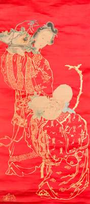 ink and colour on cut paper laid on silk, with gold paint, depicting Shou Lao accompanied by Guanyin