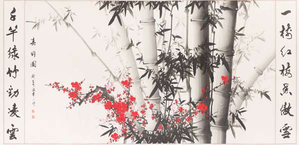 ink and colour on paper, depicting prunus branches with bamboo and with a calligraphic inscription