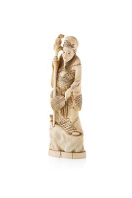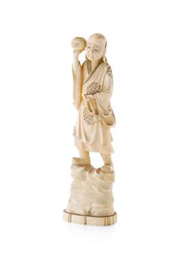 comprising a group carved with figures and a large fish, 18cm high; a robed figure with a staff and fan, signed, 21cm high; and a robed figure with elongated ears holding beads, signed, 22cm high (3)