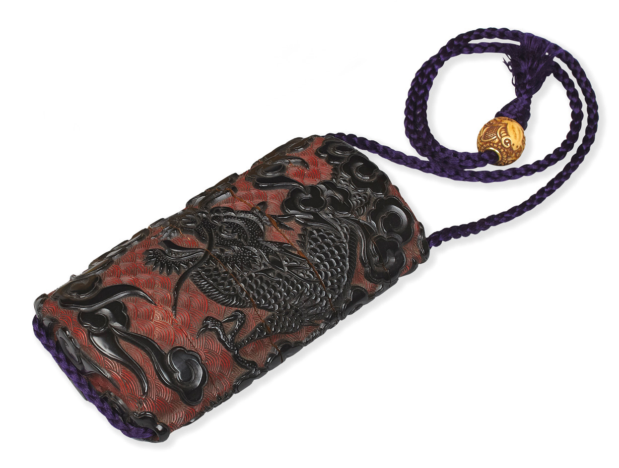 carved in relief depicting a coiling dragon and phoenix amongst clouds, against a field of waves, with a modern silk cord and ojime