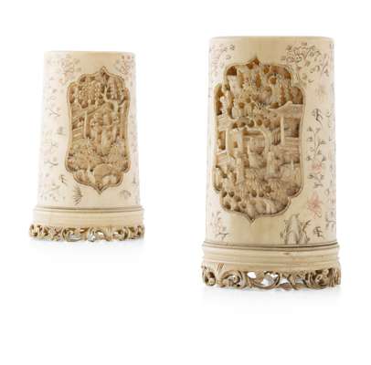 the cylindrical sides carved with panels depicting figures and temples in landscape views (2)