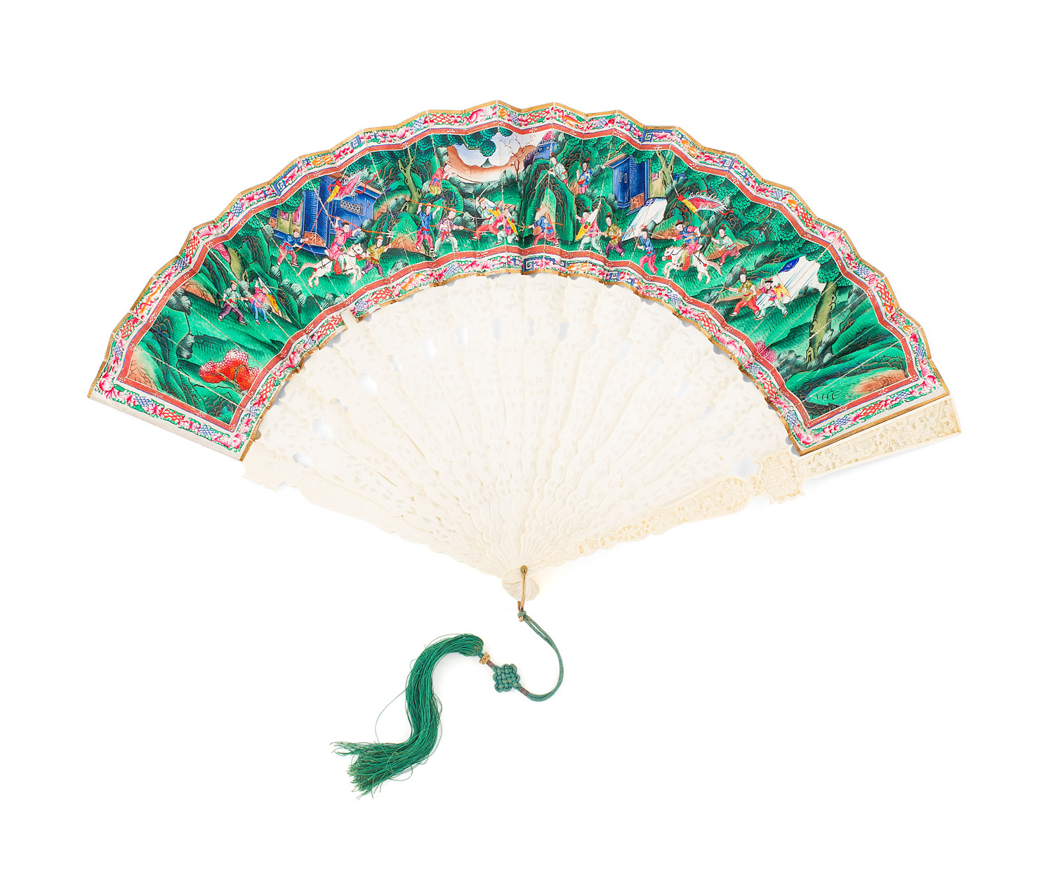 the guards carved in low relief with figures engaged in various activities, opening to sixteen pierced sticks carved with figures and floral motifs and painted panels depicting a hunting scene on one side and courtiers, flowers and birds on the other; with an associated black lacquer box