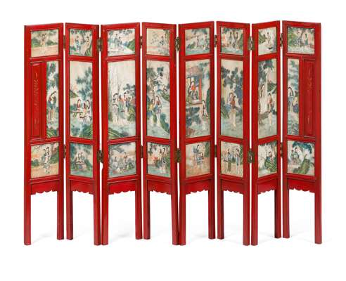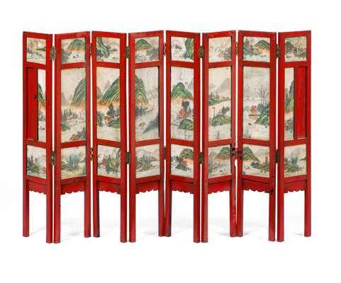 RED LACQUER AND PAINTED MARBLE EIGHT PANEL SCREEN