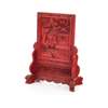 the main panel depicting a courtyard scene, with two ladies painting in an interior and two further ladies sitting on a bench in the garden, with a pavilion on the background, the stand carved allover with dragons amongst clouds, with a dragon panel on one side and a phoenix panel on the other