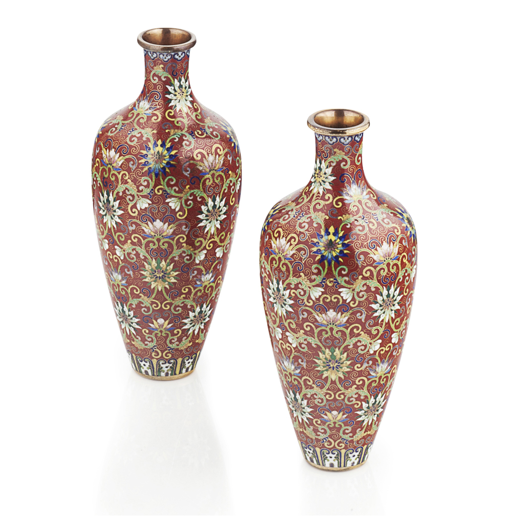 the baluster sides finely decorated throughout with lotus flowers against a red ground (2)
