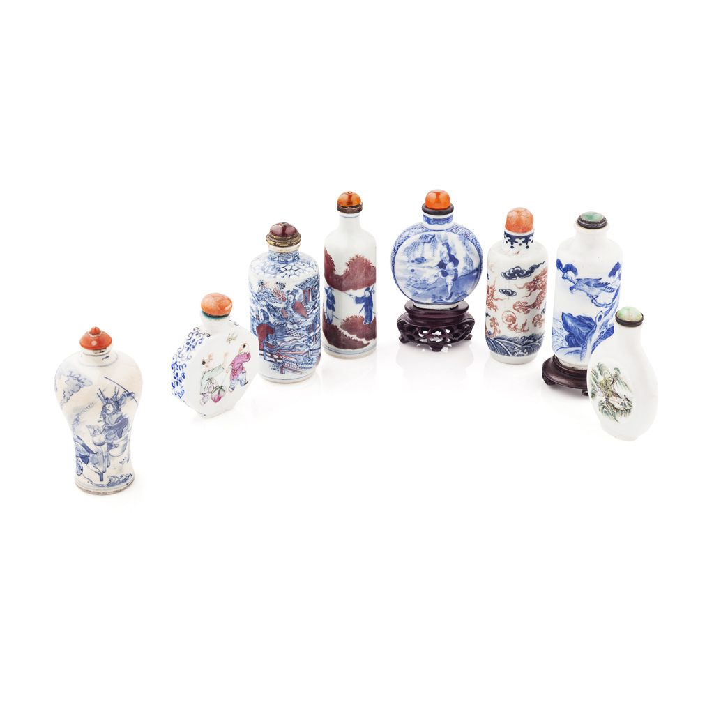 comprising; a moonflask-form bottle finely painted in underglaze blue with a pair of chickens, the other side with a fisherman all within diaper borders, the base with apocryphal Yongzheng mark, three cylindrical underglaze blue and red bottles, one with phoenix and rider in flight, one with a dragon, and one with figures leading a horse, a polychrome octagonal bottle with boys, peach and bat, a soft paste underglaze blue meiping form bottle with warrior on horseback pursuing a farmer and cart, a flattened oval polychrome bottle with landscape, the reverse with figures, and an underglaze blue cylindrical bottle with a hawk perched in a pine tree, looking down on a rodent (8)