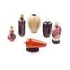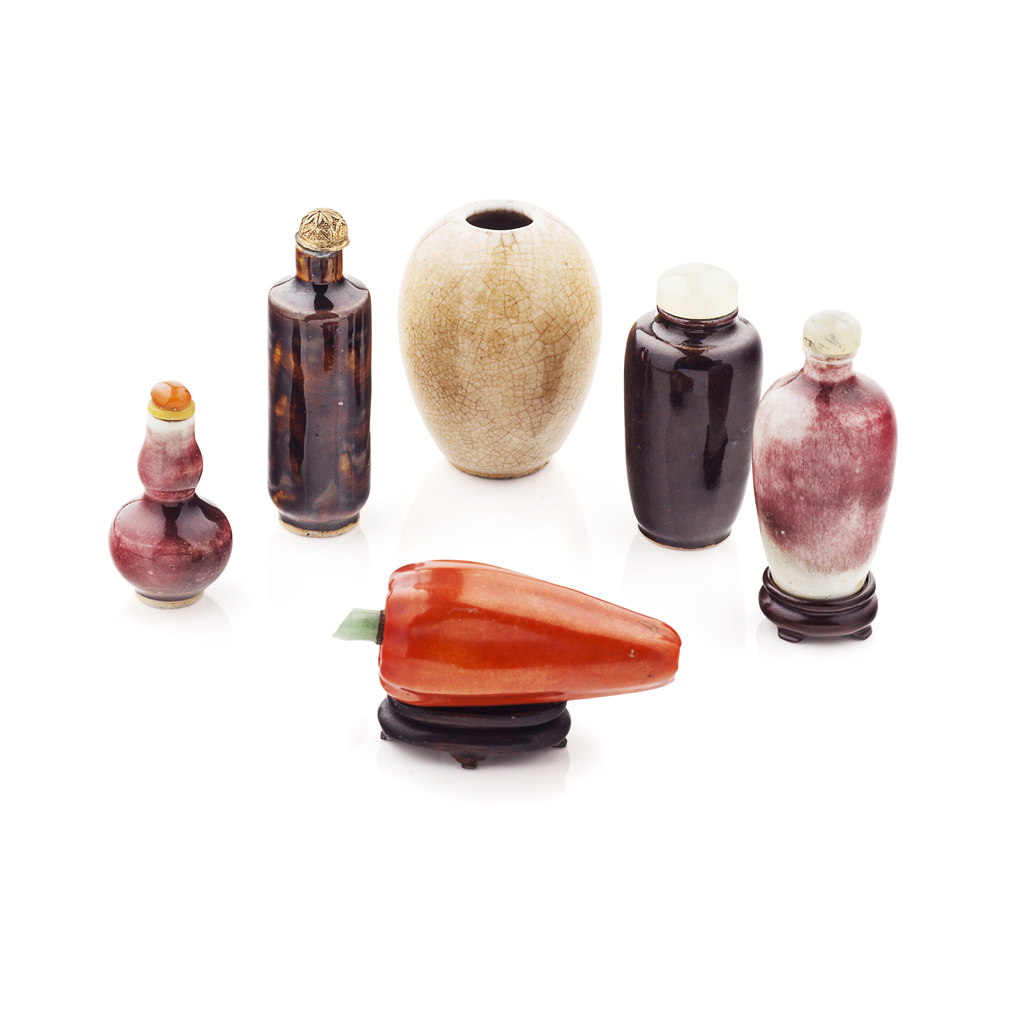 comprising a sang de boeuf double gourd shape bottle, an iron red glazed pepper form bottle, a sang de boeuf ovoid shape bottle, a mottled brown glaze snuff bottle, a teadust type ovoid bottle and a ge glaze ovoid miniature vase (6)