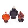 comprising; a flattened round peach form amber bottle, carved with two bats beneath a leafy tree, a pebble form amber bottle carved as a mythological beast, and a large rounded square form lacquer bottle, the base with seal mark (3)