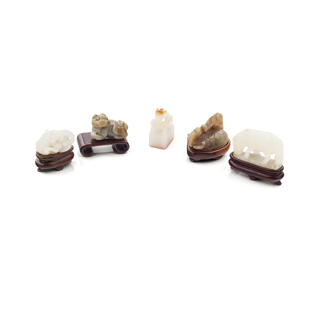 comprising; a hat ornament in the form of a tortoise-dragon of celadon and brown tone, a finely carved white jade grazing horse drilled as a pendant, a celadon and brown cat pendant, a white jade recumbent horse and a white jade seal in the form of a mythological creature (5)