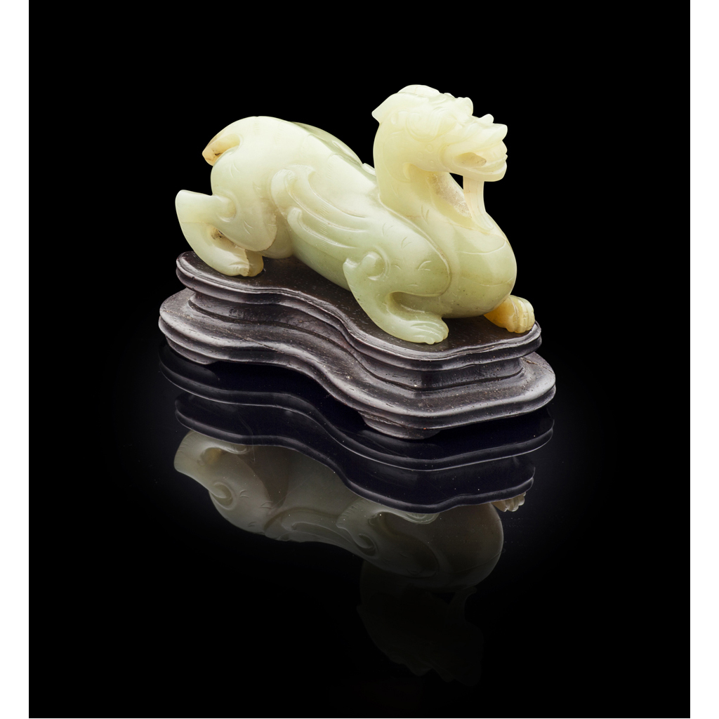 the stone of yellow-green tone, the animal lying on its stomach with its wings attached to its body either side and gazing upwards, on hardwood stand