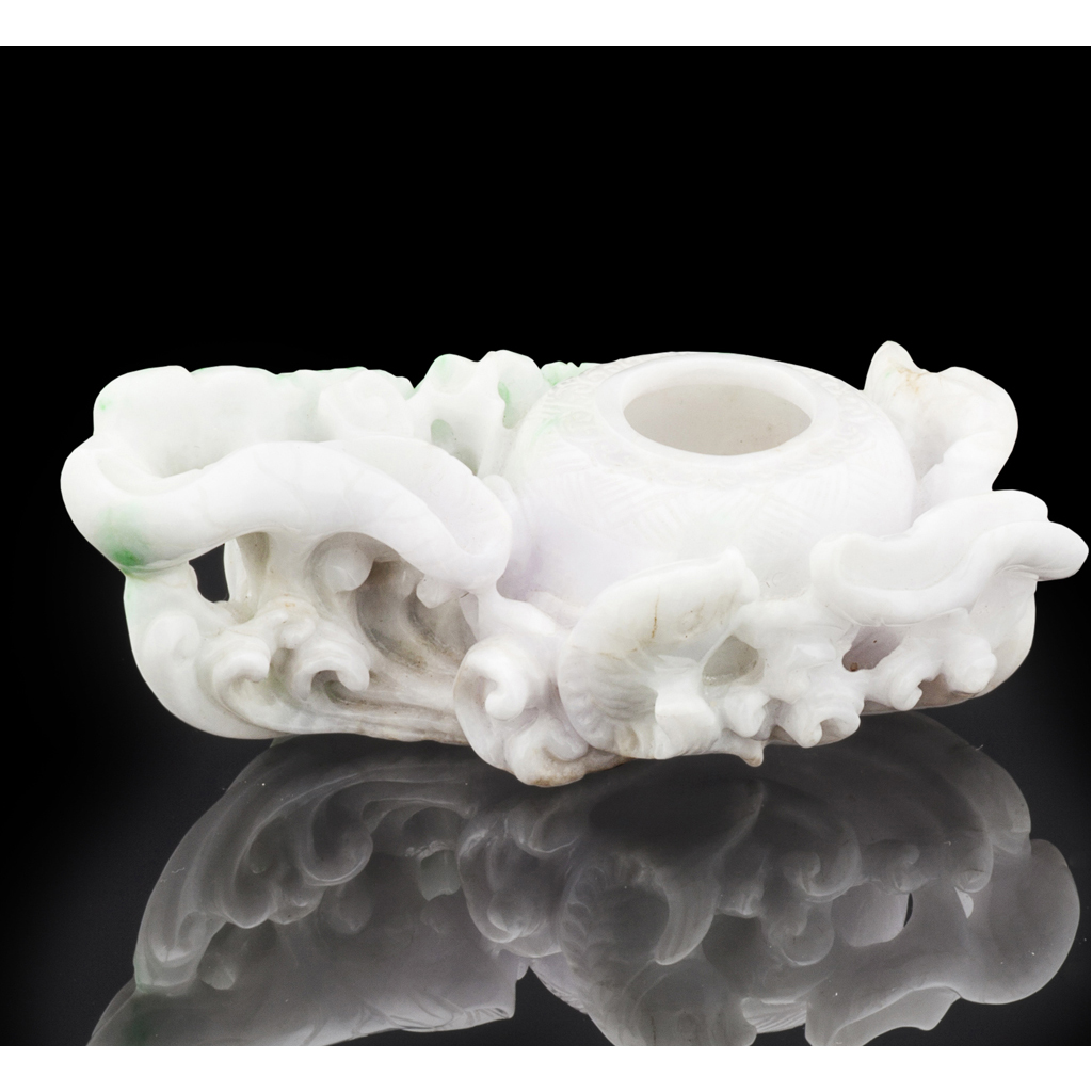 the white body with green inclusions, carved as a bowl in a pond setting with dragon, fish and lotus