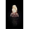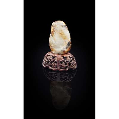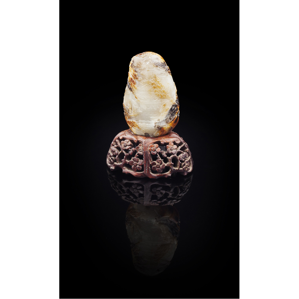 of white, russet and black tones, the russet skin cleverly carved as a pinetree trunk, its branches enclosing the pebble, finely carved in low relief with a figure on a boat sailing by a pavilion in a landscape, a waterfall on the reverse, on hardwood stand carved with flowers