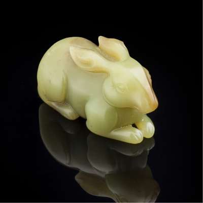 of naturalistic form and olive green tone, the animal lying on its stomach with its ears over its back