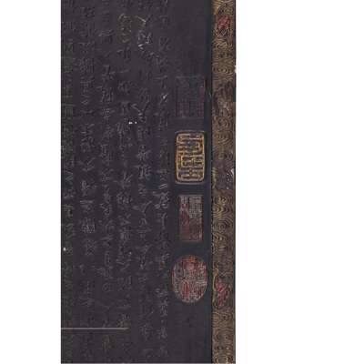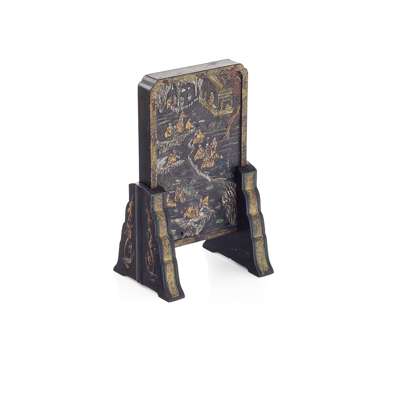 the front carved in low relief and decorated with gilt, silver and polychrome enamels with scholars sitting on the banks of a river and in a pavilion, the supports decorated with dragons, the foliate rim with bats and clouds, the back with inscriptions and seal marks