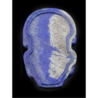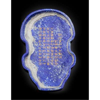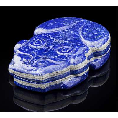in the shape of a cat, the cover carved in low relief with the animal's snout and paws, with gilt inscription to the underside of the cover, the interior with grey inclusions and carved with a bat carrying a string of cash