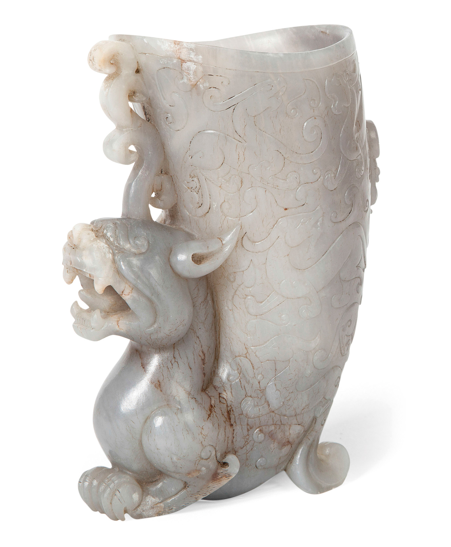 the foot in the shape of a single horned bixie, its two-horned pair carved as a mask on the body of the vase, carved allover with further bixie
