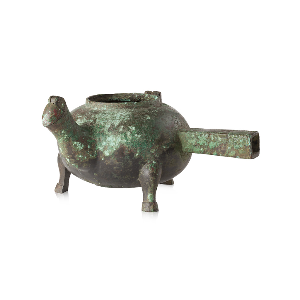 of globular form, with a covered spout and square handle, raised on three hoof feet, cover lacking