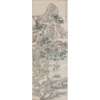 hanging scroll, ink and colour wash on paper, depicting a group of travellers, some on foot and others riding donkeys, within a wild mountainous landscape, framed