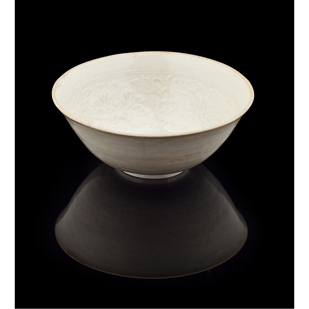 of flared form, with underglaze moulded peony scroll decoration to the interior