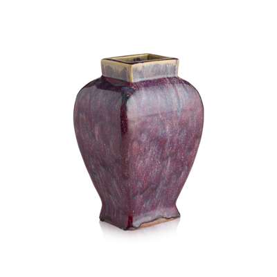 of baluster form with squared sides, decorated in a rich purple glaze with turquoise-blue inclusions, the borders of the rectangular neck with yellow-brown glaze