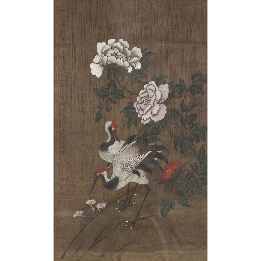 painting on silk, depicting two cranes amongst peonies, with inscription and seal mark, framed