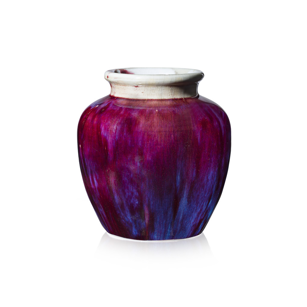 of globular form, the sides with rich raspberry red glaze streaked with turquoise-blue, the neck with cream crackled glaze with rasperry inclusions