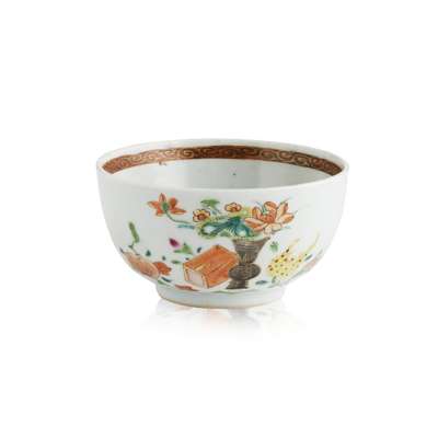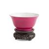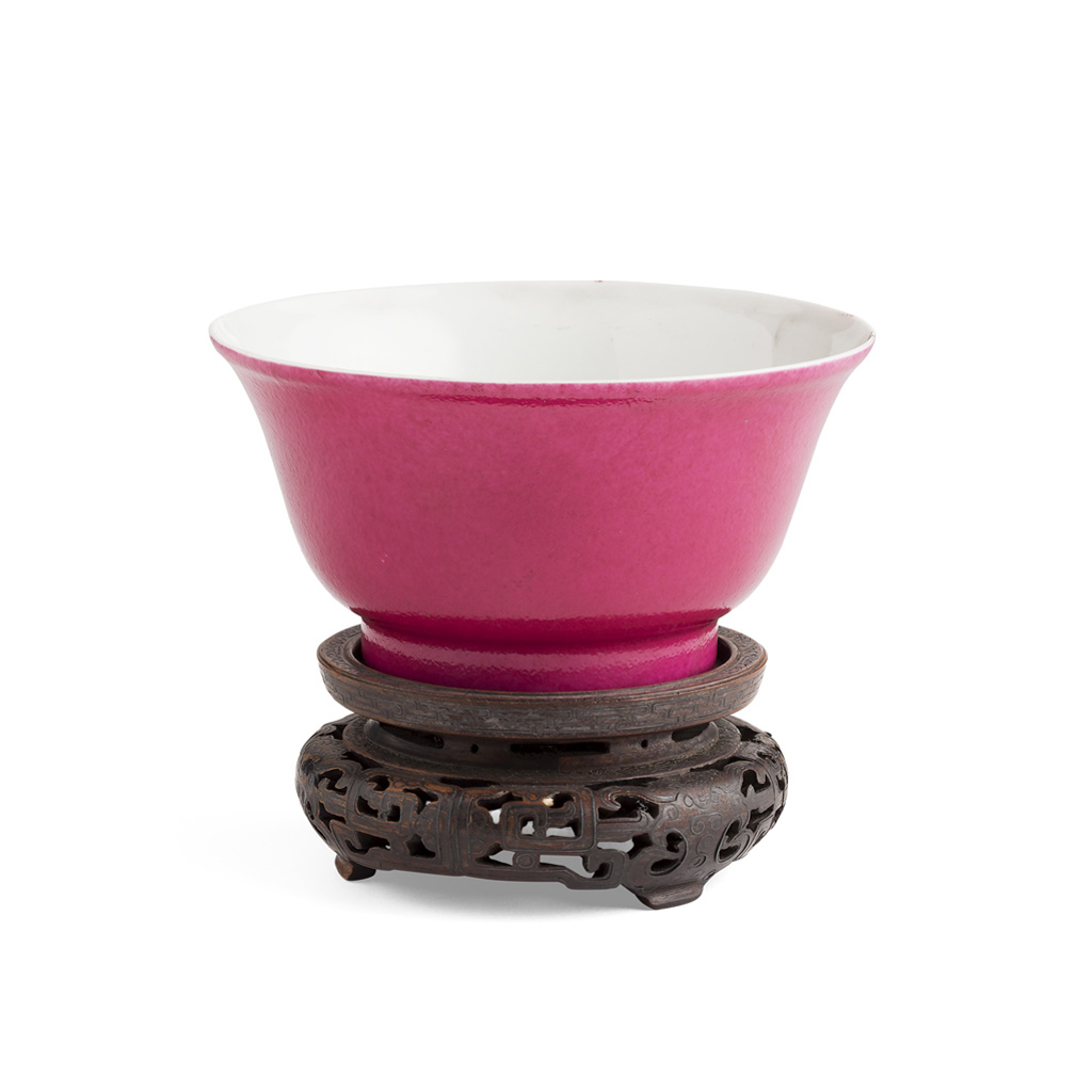 the flared sides with a rich raspberry pink textured glaze, wood stand, 11.5cm diam; together with an 18TH CENTURY TEA BOWL, the exterior decorated with antiques, peonies and fruits, the interior with central peony and a design of clouds to the rim, 9.5cm diam (2)