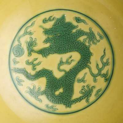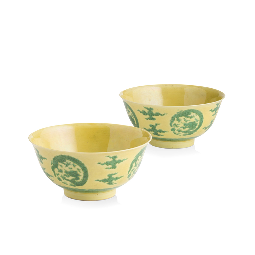 PAIR OF YELLOW AND GREEN 'DRAGON' BOWLS