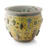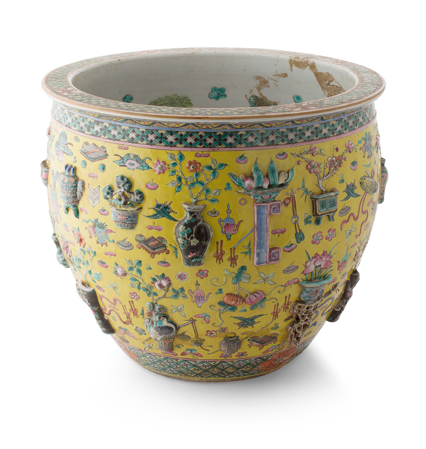 the interior painted with gold fish amongst foliage, the exterior decorated in relief with flowering vases and auspicious items reserved against a yellow ground
