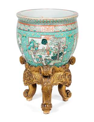 FAMILLE VERTE FISH BOWL AND GILTWOOD STAND