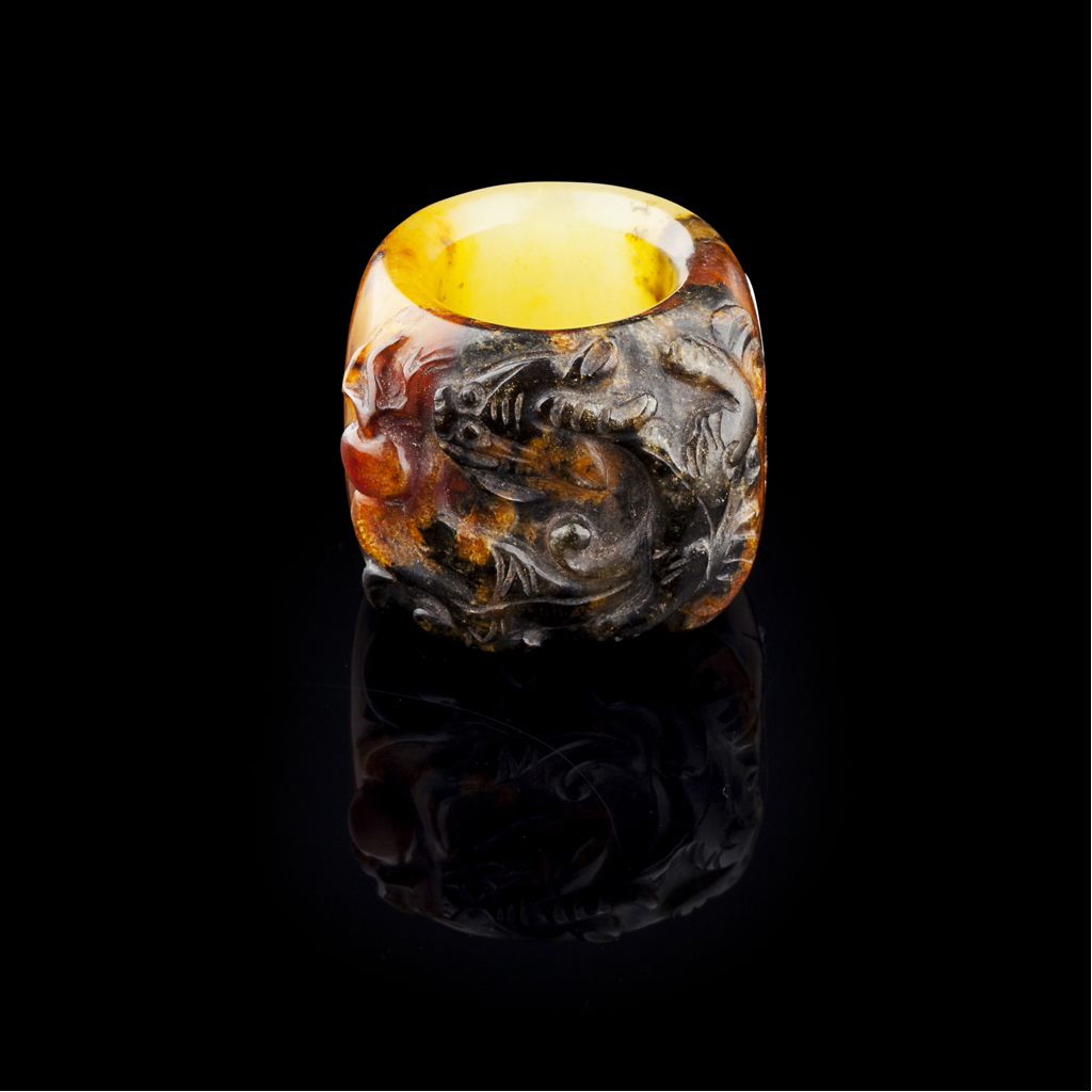 the stone of yellow, russet and dark brown tones, carved with a dragon chasing the flaming pearl