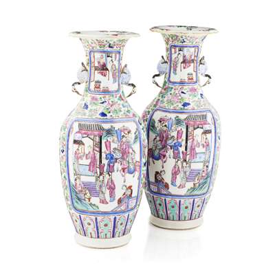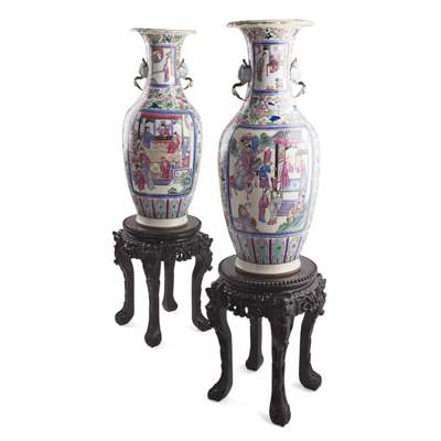 PAIR OF CANTON BALUSTER VASES AND STANDS
