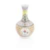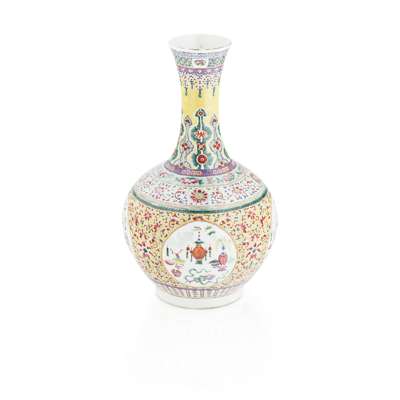 of globular form with flared neck, the yellow ground with scrolling lotus decorated with reserves of antiques, the shoulder with similar design on blue ground with further floral and keyfret bands, topped by stylised leaf lappets, the neck with tassled ruyi head border