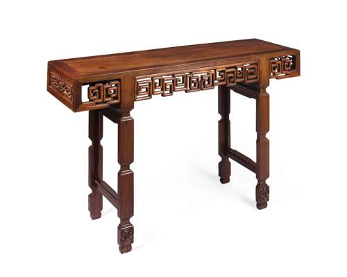 the cleated rectangular top above an open carved scroll frieze raised on shaped square legs with mask feet