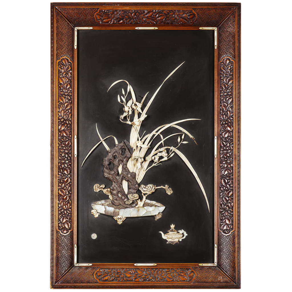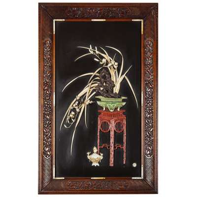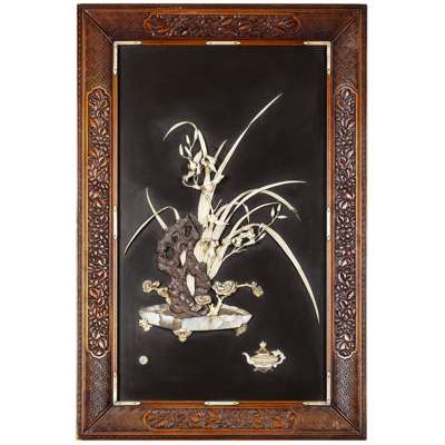 each inlaid in relief with flowering urns in bone, mother of pearl and lacquer, within contemporary carved wood frames (2)