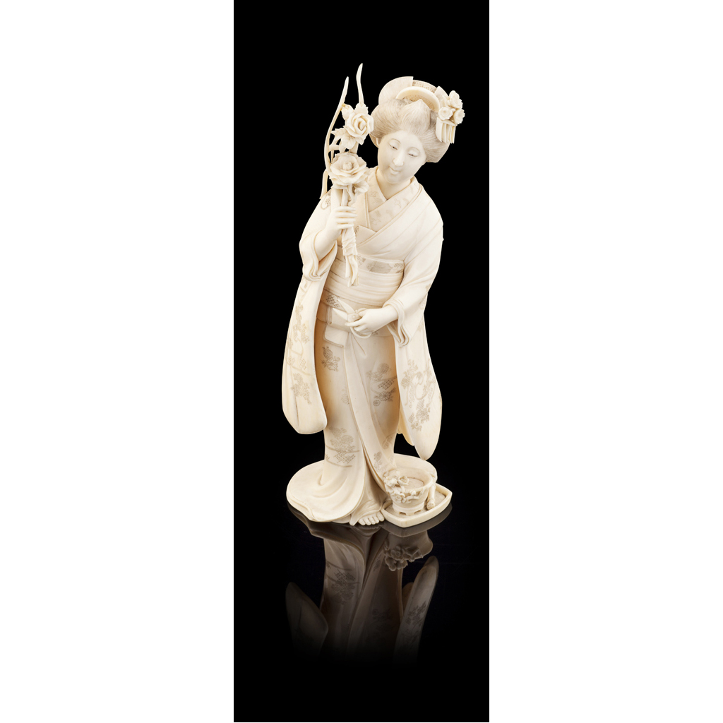 JAPANESE CARVED IVORY OKIMONO OF A BIJIN Y