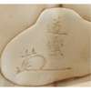 the figure wearing an elaborately decorated kimono with an obi intricately carved with flowers, holding an open fan in one hand above her head and another closed fan in the other hand, signed to underside