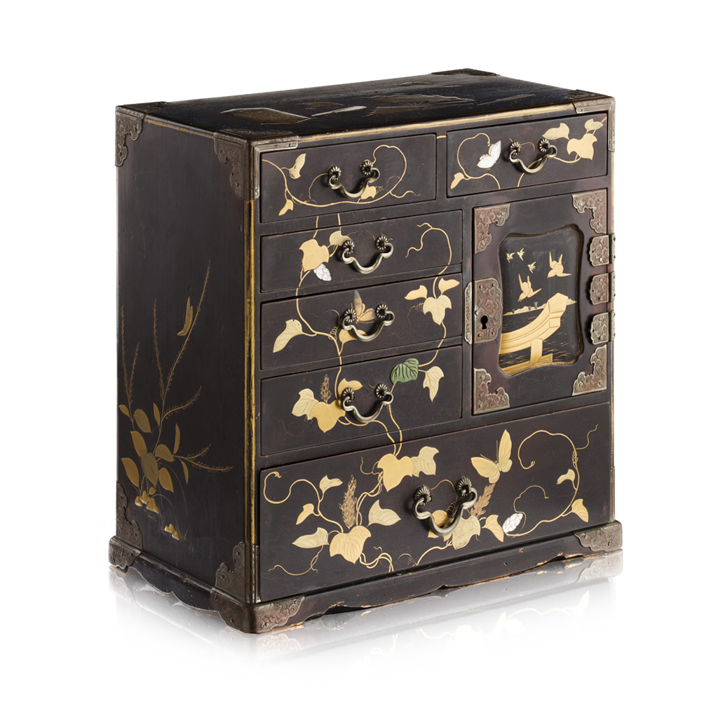 the front divided into multiple drawers and compartments decorated in gilt, ivory and mother of pearl with scrolling vines and butterflies, the door to one compartment with birds in flight over pagodas, one side with lilies and a bird in flight, the other with a cricket perching over leafy branches, the top decorated with a group of fans, the metal mounts carved with scrolling leaves, the interior with maki-e lacquer decoration